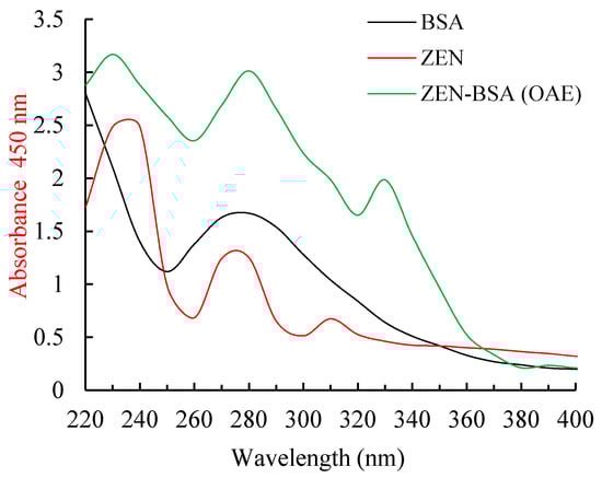 Ultraviolet (UV) scanning spectroscopy was used to confirm the synthesis of the immunogen ZEN-BSA. The molecular binding ratio of Zen to BSA was calculated based on Lambert–Beer law, A = εCL (where A is the absorbance value, ε is the molar extinction coefficient, (constant value), C is the solute concentration, and L is the optical path).