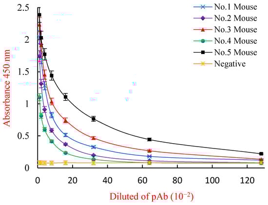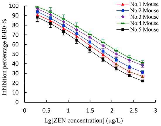 The inELISA procedure was similar to that described in a previous study []. Briefly, the coating antigen ZEN-OVA was diluted in CBS at 2 μg/mL, added to the 96-well microplate at 100 μL/well, and incubated at 37.8 °C for 2 h. The microplate was washed thrice using PBST, and unbound active sites were blocked with 250 µL/well of blocking buffer at 37.8 °C for 1 h or at 4 °C overnight. The microplate was then washed, and 50 μL/well of ZEN antibody at an appropriate dilution was added and incubated at 37.8 °C for 15 min. The microplate was washed again, and GaMIgG-HRP (50 μL/well) was added, then incubated at 37.8 °C for 30 min. The microplate was washed six times and 60 µL/well was freshly prepared. The TMB solution was added, then incubated at room temperature for 10 min. The reaction was stopped by adding 2 mol/L H2SO4 (100 μL/well), then the absorbance was measured at 450 nm. Pre-immunization of serum and PBST were used as negative and blank controls, respectively. The ZEN antibody titers were calculated as the reciprocal of the dilution, causing an absorbance value twice that of the blank value.
