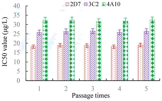 The antibody affinity reflects its binding strength with an antigen. The affinity constant (Ka) represents the antibody affinity. The equilibrium dialysis method, the Scatchard diagram method, the Batty saturation method, the competitive binding method, and the precipitation method are the commonly used to determine Ka. In this study, the Batty saturation method, a simple, rapid, and reliable method, was used. The Ka of 2D7, 3C2, and 4A10 were 6.54 × 109, 5.32 × 109, and 4.15 × 109 L/mol, respectively, (Figure 8), indicating that 2D7 had the highest affinity.