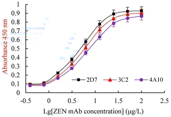 The in vivo-induced ascites method was used to produce several ZEN mAbs []. Briefly, a mature female Balb/c mouse was intraperitoneally injected with 0.8 mL of paraffin ten days before receiving an intraperitoneal injection of the positive hybridoma cells (1 to 5 × 106 cells). Ascites fluid was collected two weeks later. The saturated ammonium sulfate precipitation method was used to purify the ZEN mAb and then stored at −20 ℃ for subsequent analysis.