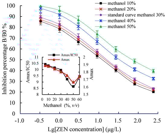 The effects of methanol concentration on icELISA. Each value represents the mean of three replicates. icELISA: indirect competitive enzyme linked immunosorbent assay.