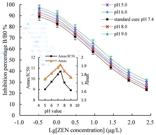 The effects of pH value on an icELISA. Insets indicate the fluctuations of Amax/IC50 (Y-principal axis) and Amax (Y-secondary axis) as a function of pH value. Each value represents the mean of three replicates.