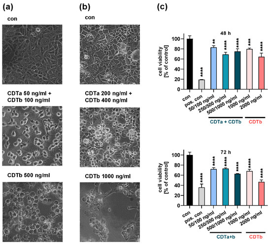 CDTb causes cell rounding and impairs cell viability. Vero (a) and CaCo-2 (b) cells were incubated with a combination of CDTa and CDTb or with CDTb alone. After 3 h, images of cell morphology were taken. (c) Cell viability of CaCo-2 cells was determined after 48 and 72 h after incubation with different concentrations of CDTa plus CDTb or CDTb alone. For positive control (pos. con), cells were exposed to osmotic shock by double-distilled water. Values are given as percentage of control, mean ± SD (n = 3). Significance was tested using one-way ANOVA followed by Dunnett’s multiple comparison test (** p ≤ 0.01, *** p ≤ 0.001, **** p ≤ 0.0001 vs. con (untreated control).