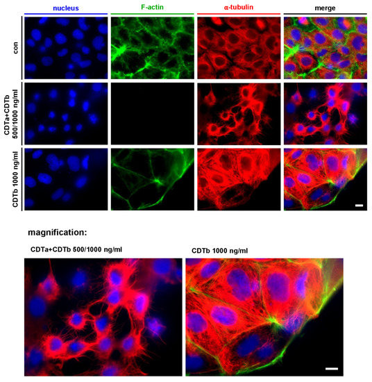 Treatment of CaCo-2 cells with the combination of CDTa plus CDTb led to the typical loss of F-actin (Figure 2). G-actin that has been ADP-ribosylated by CDTa acts as a capping protein on actin filaments, inhibiting the addition of further G-actin monomers. This leads to depolymerization of the actin cytoskeleton and loss of F-actin signal (Figure 2, second row). Moreover, the formation of microtubule-based protrusions (Figure 2, second row and magnification) was induced by CDTa plus CDTb as described before [30,31]. In contrast, CDTb did not cause microtubule-based protrusions but led to the redistribution of F-actin signals in cells treated with CDTb alone (Figure 2, third row). The signal for F-actin is reduced in the cell body and is concentrated at the cell cortex. The increased signal for α-tubulin in CDTb-treated cells is most likely due to cells starting to round up, causing a condensed and thus intensified signal.