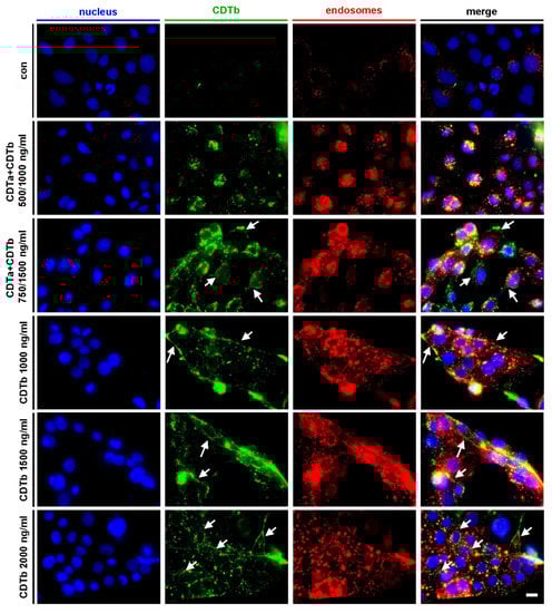 When cells are treated with 500 ng/mL CDTa plus 1000 ng/mL CDTb (Figure 3, second row), CDTb signals are predominantly found as dots that colocalize with signals of early endosomes. This indicates that the majority of CDTb is endocytosed if applied together with CDTa. When cells are exposed to the same concentration of CDTb (1000 ng/mL) in the absence of CDTa (Figure 3, 4th row), CDTb signals at the cell borders that did not colocalize with early endosomes are detected additionally to endosomal CDTb. This distribution of CDTb signal is also found in higher concentrations of CDTb (Figure 3, 5th and 6th row). Moreover, CDTb signals at cell borders are also observed if higher concentrations of CDTa plus CDTb are applied (Figure 3, 3rd row). These results indicate that CDTb alone and in higher concentrations, also in the presence of CDTa, is only partially endocytosed and partially resides at the cytoplasmic membrane. This is in line with our earlier finding that CDTb forms pores into the cytoplasmic membrane, thereby causing cytotoxicity [25,26,27].