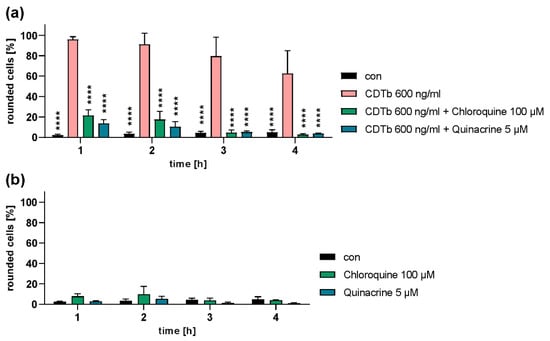 Cells are protected from CDTb-induced cell rounding by chloroquine and quinacrine. Vero cells were treated with CDTb in the presence or absence of chloroquine and its derivative quinacrine at indicated concentrations (a). For control, cells were treated with chloroquine and quinacrine alone (b). For further control, cells were left untreated (con). Images were taken after the indicated time points, and percentage of rounded cells was determined. Values are given as percentage of control, mean ± SD (n = 3). Significance was tested by two-way ANOVA followed by Dunnett’s multiple comparison test. (a) All samples were compared to samples treated with CDTb only. **** p ≤ 0.0001. (b) No significant differences were detected between all samples.