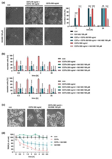 For intoxication experiments, cells were seeded in culture dishes, and toxin components were added. Well plates and culture dishes were purchased from TPP Techno Plastic Products (Trasadingen, Switzerland). To test the effect of inhibitors, the respective inhibitor was added to the cells together with the toxin components. After different incubation times, images were taken using a Zeiss (Oberkochen, Germany) Axiovert 40CFL microscope with a Jenoptik (Jena, Germany) ProGres C10 CCD camera. The percentage of rounded cells was determined from the images using ImageJ (NIH, Bethesda, MD, USA). Chloroquine and quinacrine were obtained from Sigma Aldrich (Munich, Germany) and were dissolved in H2O. HA1383, HA1495, and HA1568 were synthesized as described before [32,51,52,53,54,55].