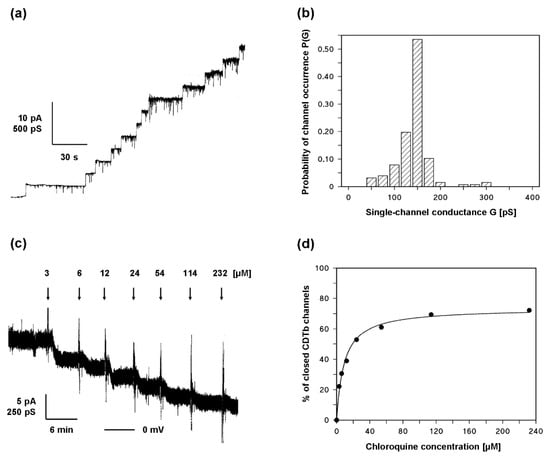 The addition of small amounts of CDTb in nanomolar concentration led to a strong increase in membrane conductance caused by channel insertion in the membrane. Figure 6a shows the channel formation by CDTb in artificial bilayers in 1 M KCl solution. The channels showed some flickers to lower conductance states but otherwise had a stepwise appearance with a long lifetime. The single-channel conductance was around 150 pS under these conditions (see Figure 6b). When the reconstitution of CDTb channels was followed for a longer time, the conductance was virtually stationary after about 30 to 60 min. At that time, the titration of membrane conductance with chloroquine started by adding small amounts of concentrated chloroquine solution to both sides of the membrane while stirring. Shortly after each addition, the CDTb-induced conductance decreased in a dose-dependent manner as shown in Figure 6c. The titration curve given in Figure 6c can be analyzed using a Langmuir adsorption isotherm, as shown in Figure 6d. The analysis yielded a stability constant K of 110,000 M−1 (half saturation constant Ks of 9.1 µM) for the binding of chloroquine to the CDTb channels. The percentage of conductance that responded to ligand binding was about 74% in the case of the experiment shown in Figure 6c,d.