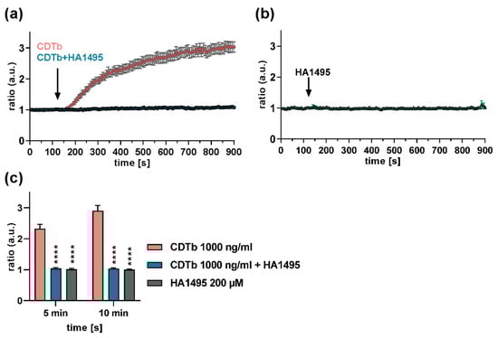 HA1495 prevents CDTb-mediated Ca2+ influx in CaCo-2 cells. CaCo-2 cells were incubated with Fura-2 (3 µM) for 45 min at 37 °C. After baseline recording for 2 min of the ratio of Fura-2 at 340 and 380 nm, 1000 ng/mL CDTb or 1000 ng/mL CDTb plus 200 µM HA1495 were added to the cells simultaneously (a). For control, cells were treated with 200 µM HA1495 alone (b). Time of applications is indicated by arrows. (c) Bar graph showing results 5 min and 10 min after initial application of different treatments (first arrow in a, b). Values were normalized to untreated control and are given as mean ± SD (n = 3). Significance vs. CDTb was tested by two-way ANOVA followed by Dunnett’s multiple comparison test. (**** p ≤ 0.0001).