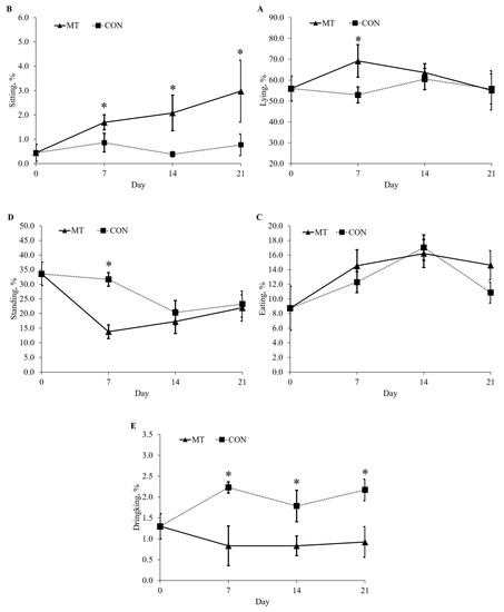 Behavioral activities of lying (A), sitting (B), eating (C), standing (D) and drinking (E) 9-week-old nursery pigs fed either a diet without deoxynivalenol (CON) or a diet with 3.8 mg/kg of naturally contaminated deoxynivalenol (MT). An instantaneous scan-sampling method with 1 min intervals was used to determine percentage of time spent on various behaviors for every other hour from 8:00 a.m. to 8:00 p.m. on day 0, 7, 14 and 21 of the experiment. Each data point represents the mean ± SE of 8 barrows. * p < 0.05.