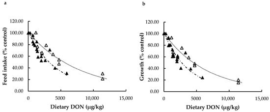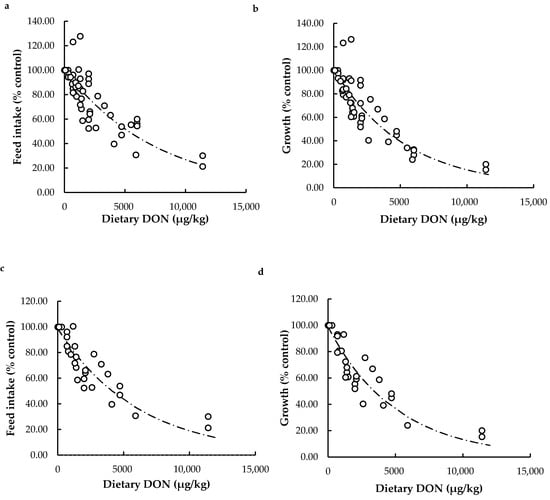 Feed intake and growth data collected in both meta-analyses were converted to relative values compared to their control and expressed as feed intake (% control) and growth (% control). The effect of dietary DON challenge on relative feed intake and growth was assessed by regression analysis. Exponential curves had the most logical fit and explained the greatest degree of variation in effects on feed intake and growth caused by dietary DON intake. Graphs and estimated equations derived from the exponential model are given in Figure 2.
