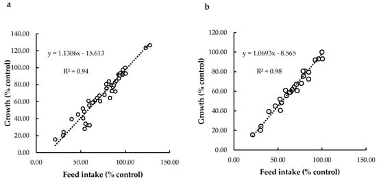 To date, little attention has been paid to the potential interference between reduced feed intake caused by DON and observed reductions in growth in fish. Only a few studies in rainbow trout added to their experimental design an additional control treatment, in which fish received the same amount of feed consumed by the group challenged with the highest dose of DON (pair-fed). One study showed significantly impaired growth in the DON treated group against the control [112], but other studies [113,114] did not find significant effects. The outcomes from these pair-fed investigations, therefore, are not fully conclusive either. For that reason, we used the data collected in our meta-analysis to further explore the correlation between feed intake and growth response. Regression analysis showed a linear relationship between relative feed intake (% control) and growth (% control) for all fish species, including trout only (Figure 4). According to our model, 94% of the variation in fish growth (98% for trout only) can be explained by the feed intake response. Our data strongly indicate that the impact of DON on fish growth is mostly driven by feed intake. This conclusion, however, is affected by the experimental design of the studies included in our dataset employing satiation feeding strategies, resulting in differences in feed intake. Only if experimental groups are exposed to equal amounts of feed can future experiments aim to unravel the direct effects of DON on fish growth.
