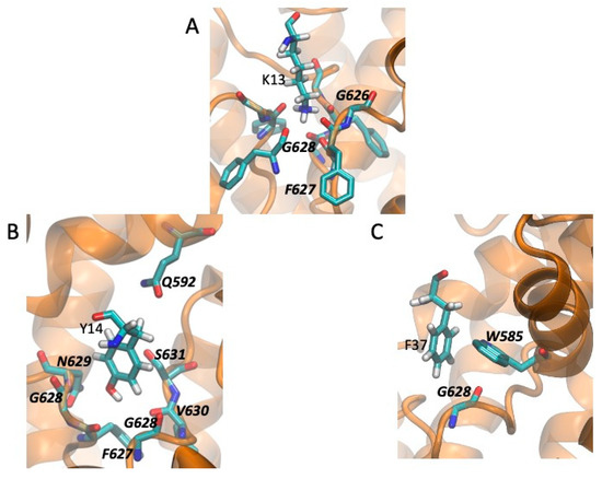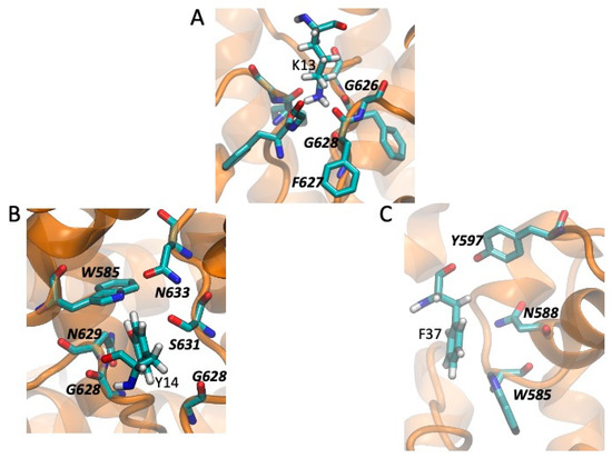 In the first group we find K13, Y14, and F37. K13 engages in the same interactions for both toxins (Figure 6A and Figure 7A). Y14 interacts with the floor of the pore in both cases but differs mainly in its interaction with Q592 in CmERG1 (Figure 6B) and with W585 in CnERG1 (Figure 7B). F37 interacts with W585 in both toxins, but lies closer to the floor of the pore, interacting also with G628 in CmERG1 (Figure 6C); in CnERG1 it interacts more with turret residues N588 and Y597 (Figure 7C). This could be one of the reasons for the lability of CnERG1 in blocking the current completely.