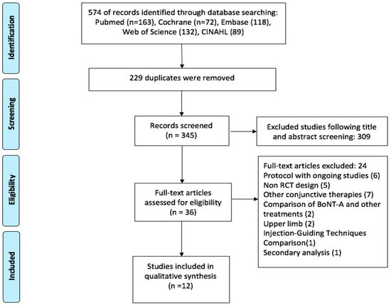We presented a PRISMA flow chart of the selection process in Figure 1. The original search for this systematic review was run from inception up to February 2021. Initially, 574 articles were found from five electronic libraries, then 229 duplicates were excluded. After reviewing titles and abstracts, 309 apparent irrelevant papers were removed. Of these 36 remainders, we then excluded 24 studies for several reasons: protocol with ongoing studies (n = 6), non-RCT design (n = 5), other conjunctive therapies combined with BoNT-A injection (n = 7), comparison of BoNT-A and other treatments (2), upper limb (n = 2), injection-guiding techniques comparison (n = 1), secondary analysis (n = 1). Eventually, 12 studies fulfilled the eligibility, in which six studies were randomized placebo-controlled trials [13,15,19,20,21,22], three studies were randomized, placebo-controlled, dose-ranging studies [14,16,23], and three studies were randomized dose-ranging study [24,25,26]. All included studies assessed by the PEDro scale gained a score range of 9 or 10 of good quality, the risk of bias assessment was detailed in Table S1. Of the 12 included studies, two were conducted in France [13,22], two in China [20,26], three were multi-centre, multinational trials [16,21,23]. The remaining five studies were conducted in Germany [19], Japan [15], Italy [24], Australia [14], and Brazil [25]. The majority of trials used BoNT-A for PLES in the chronic stage; only 75 patients in two studies received BoNT-A injection starting less than three months after the event [19,20]. The characteristics of the 12 included studies are detailed in Table 1.