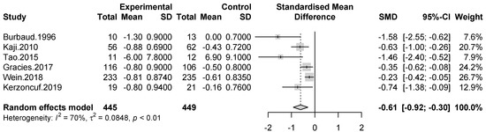 Data from spasticity assessment at week four were available in six studies. A significant effect size was observed in the improvement of muscle tone in the interventional group compared to control group (SMD = −0.61 [95% confidence interval: −0.92; −0.3]; p < 0.0001, I2 = 70%). (Figure 2)