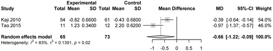 At eighth week after the intervention, muscle tone was significantly improved in BoNT-A groups when compared to control group (MD = −0.66 [95% confidence interval = −1.22; −0.09]; p = 0.02, I2 = 83%). (Figure 3)