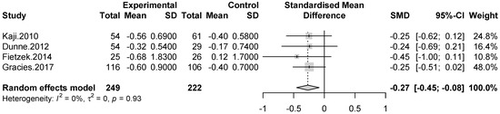 Meta-analysis including four trials demonstrated a significant efficacy without heterogeneity in favor of BoNT-A compared to placebo remained to week 12 after the intervention (SMD = −0.27 [95% confidence interval = −0.45; −0.08]; p = 0.0041, I2 = 0%). (Figure 4).