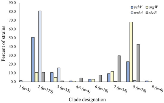 Stratification by clade showed differences in the frequency of the occupied sites across lineages. Among the 343 strains previously classified by SNP genotyping [28], most belonged to clade 2 (n = 175), followed by clades 8 (n = 76), 3 (n = 35), 7 (n = 34), 6 (n = 10), 9 (n = 6), and 1 (n = 3). Four strains belonged to clades 4 or 5 and were grouped together based on clustering within the phylogenetic tree. Notably, 80.8% and 50.6% of the clade 2 strains had an occupied wrbA site or an occupied yehV site, respectively, while clade 8 strains frequently had occupied argW (68%) or sbcB (42.9%) sites (Figure 2). Those strains belonging to clade 8 were significantly more likely to have occupied sbcB and argW sites compared to all other clades (p < 0.0001) but were less likely to have an occupied wrbA site (Fisher’s exact test p < 0.0001). However, clade 2 strains, were significantly more likely to have an occupied wrbA site relative to strains from the other clades (Fisher’s exact test p < 0.0001); only three of these strains had intact sites.