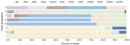 The occupancy profiles, which represented the status of DNA integration at all four insertion sites, were significantly different by clade (Mantel–Haenszel chi-square test = 31.4, df = 1, p < 0.0001). Most strains belonging to clade 2, for instance, (n = 145, 82.9%) had the OIOI integration profile with occupied yehV and wrbA sites and intact argW and sbcB sites (Figure 3). This OIOI profile also predominated in clades 1 and 3, which comprised strains that were more closely related to clade 2 strains than the other lineages. Twenty additional clade 2 strains had three occupied sites representing profiles OIOO (n = 10, 5.7%) and OOOI (n = 10, 5.7%), while the remaining 10 strains had 3 additional profiles. Occupancy profile OIIO was found most frequently in strains belonging to clades 4, 5, and 6; a high frequency of OOIO was also observed. By contrast, two predominant profiles were identified in the clade 8 strains: OOIO (n = 37, 48.7%) with occupied yehV, argW, and sbcB sites and OOII (n = 32, 42.1%) with occupied yehV and argW sites. Indeed, most of the 76 clade 8 strains had occupied yehV and argW loci (n = 70, 92.1%), though four additional profiles (OIII, OIIO, OIOI, and OIOO) were identified. Overall, strains from clades 7 and 8 were the most diverse with seven occupancy profiles each.