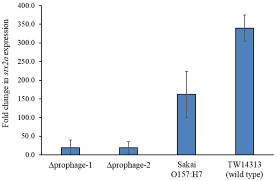 The expression of stx2a was examined in the two ∆prophageTW14313 mutants for comparison to the TW14313 wild-type strain and the Sakai O157:H7 outbreak strain. Gene expression was quantified following growth LB broth and after induction with 25 ng/mL mitomycin C (Sigma-Aldrich, Inc. St. Louis, USA) using a modified version of a published protocol [44]. Briefly, overnight cultures grown in LB at 37 °C with shaking were diluted in LB to an OD600 of 0.2–0.3. At time T0, 2 mL of culture was collected for RNA isolation and the remaining culture was divided into two tubes; mitomycin C (25 ng/mL) was added to one tube for comparison. After incubation at 37 °C for three hours, a 2 mL culture was collected for RNA isolation. RNA was extracted using the RNeasy kit (Qiagen, Valencia, CA, USA). Expression levels were compared between each mutant to the WTTW14313 strain following induction by mitomycin C relative to growth in LB alone after three hours. RNA was isolated in three separate experiments and qPCR was performed in triplicate using published stx2B primers, while the 16S rRNA (rrsH) gene was used for normalization to quantify mRNA transcription levels, as described in [24,45]. Relative gene expression was determined based on the use of an SYBR green qPCR assay with the following conditions: 95 °C for 3 min, followed by 39 cycles of 95 °C for 10 s and 55 °C for 30 s. Fold change was calculated using the ddCt method [46]; values greater than two were considered biologically significant.