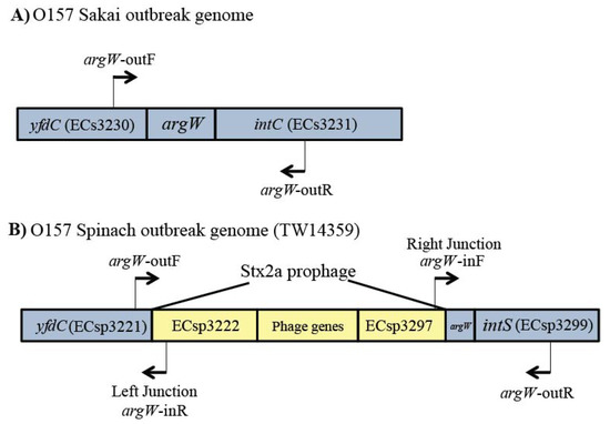 Representation of the argW Shiga toxin-encoding bacteriophage integration site in two O157:H7 outbreak strains. (A) Primers in adjacent genes allowed for the amplification of an intact argW integration site, while (B) the combination of four primers allowed for the amplification of the right and left junctions of argW when it was occupied by a Stx2a prophage. Drawing is not to scale.