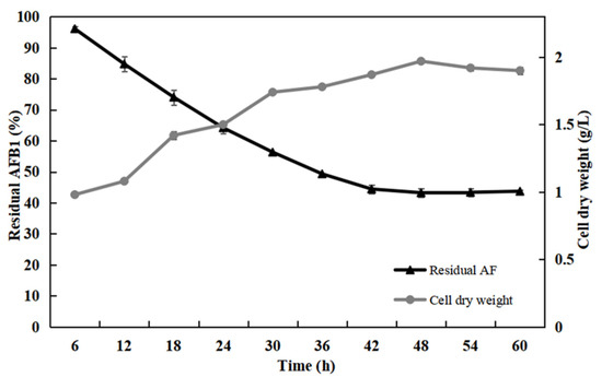 Relationship between degradation rate of Aflatoxin B1 (AFB1) and growth of Bacillus sp. H16v8 and Bacillus 423 sp. HGD9229. The AFB1 degradation rate and cell dry weight of mixed bacterial cultures were tested at different culture times, including 6, 12, 18, 24, 30, 36, 42, 48, 54, and 60 h, which was cultured in nutrient broth (NB) 37 °C, 180 rpm. All of them incubated 12 h at 37 °C in the dark without shaking. The initial concentration of AFB1 was 100 μg/L. The values were the average of three replicates and their standard errors. The mean values were significantly different according to the Duncan’s multirange test (p < 0.05).
