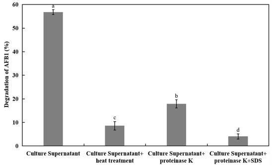 Degradation of AFB1 with the cell-free culture supernatant from mixed Bacillus cultures with or without heat, proteinase K treatment, and SDS. The samples were cultured at 37 °C for 12 h in the dark. The values were the average of three replicates and their standard errors. The mean values with the different letters were significantly different according to the Duncan’s multirange test (p < 0.05).