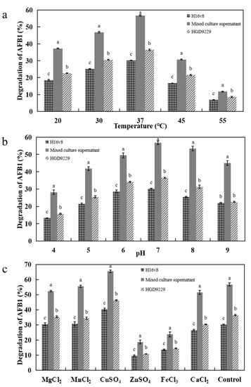 Effects of cultured temperature (a), pH (b), and metal ions (c) on the degradation of AFB1 by the culture supernatant of H16V8, HGD9229 and mixed cultures after 12 h. (a) Effect of temperature on the degradation of AFB1 by the culture supernatant of H16V8, HGD9229 and mixed cultures. (b). Effect of pH on the degradation of AFB1 by the culture supernatant of H16V8, HGD9229 and mixed cultures. (c) Effect of metal ions on the degradation of AFB1 by the culture supernatant of H16V8, HGD9229 and mixed cultures. The initial concentration of AFB1 was 100 μg/L and 12 h culture. The values were the average of three replicates and their standard errors. The mean values with the different letters were significantly different according to the Duncan’s multirange test (p < 0.05).