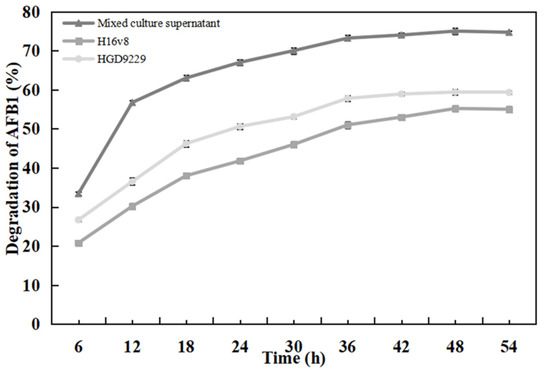 From the Figure 1, with the increase in co-culture time of Bacillus sp. H16v8 and Bacillus sp. HGD9229, the bacterial concentration gradually increased, with the decreased residue of AFB1. After 48 h of co-culture, the degradation ability of AFB1 reached the highest level. At this time, AFB1 was degraded by co-culture supernatant, and the maximum degradation rate was 56.7%. An increase in bacterial concentration may enable bacteria to produce more effective detoxifying substances, thus more effectively degrading AFB1 [26]. Therefore, the optimal co-culture time of the two Bacillus species was 48 h.