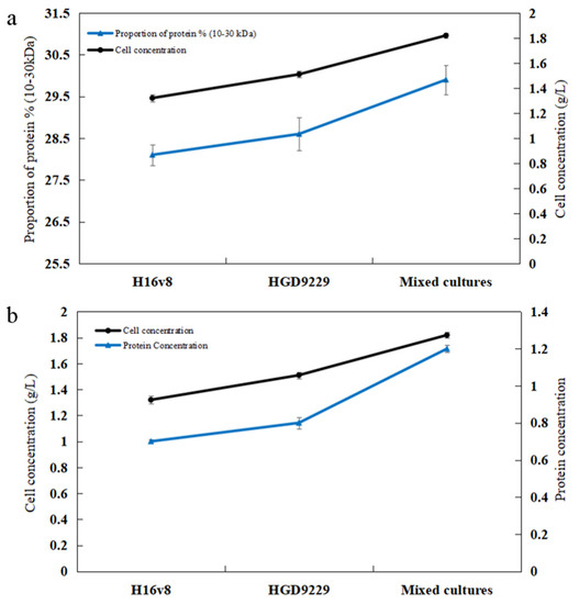 Relationship between protein content and cell concentration. (a) Relationship between cell concentration and proportion of protein (10–30 kDa). (b) Relationship between cell concentration and total protein concentration. Samples were incubated at 37 °C for 12 h. The values were the average of three replicates and their standard errors. The mean values were significantly different according to the Duncan’s multirange test (p < 0.05).