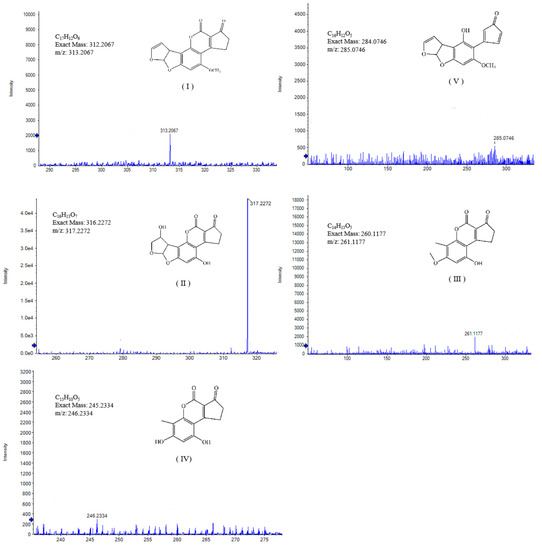These samples include degradation products and controls/blanks (cell solution without AFB1) and were analyzed by LC-Triple TOF MS to determine the uncertain composition in the degradation products. The detected composition in both degradation products and controls with the ion value of m/z 313.2067 was AFB1 (C17H12O6, Ⅰ). Figure 8 shows the mass spectrum of AFB1 and the four key products in the hypothetical degradation pathway of mixed bacterial cultures. The ion peak values of these components were at m/z 285.0746 (C16H12O5, Ⅴ), 317.2272 (C16H13O7, Ⅱ), 261.1177 (C14H13O5, Ⅲ), and 246.2334 (C13H10O5, Ⅳ), which were only detected in degradant produced by the supernatant of mixed cultures. Therefore, these results indicated that AFB1 was decomposed by biodegradation, and four products with structures that were significantly different from AFB1 could be obtained.