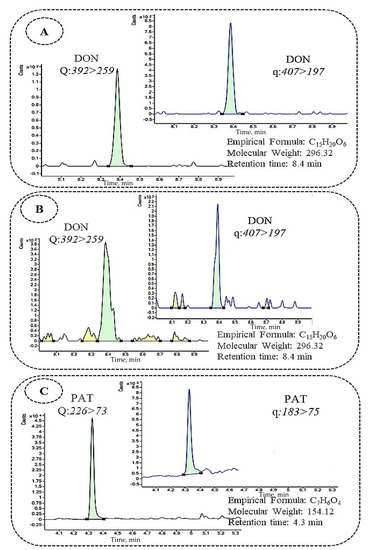 Chromatograms obtained from different beverage samples naturally contaminated with: (A) DON in beer sample (8.85 µg/L), (B) DON in wine sample (9.69 µg/L), and (C) PAT in cider sample (24.66 µg/L) through multiple reaction monitoring (MRM) by (GC-MS/MS).
