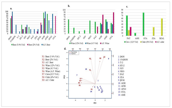 To interpret the results in terms of incidence and contents, a principal component analysis (PCA) multivariate statistical analysis technique was used (Figure 2). The distribution map for the first principal components reached 35% for PAT in wine, cava, and A.F. cider, while the second component scored 26% for β-ZAL in beer with lemonade, A.F. beer, and cider. The results revealed similar behavior for these mycotoxins in the beverage groups mentioned. In A.F. beer samples, a similar trend was obtained for DON, NIV, and AOH. The same trend for AOH and OTA was shown in A.F wine. The highest incidence was observed for OTA and PAT in cava samples.