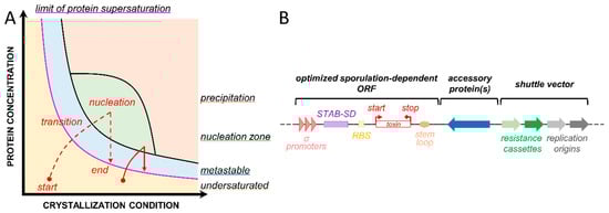 Crystallization requires a protein-specific combination of parameters. (A) The phase diagram represents the protein concentration as a function of the crystallization condition (concentration in precipitant, buffer concentration, etc.). This diagram is adapted from [10]. The concentration of the protein gradually increases to transition from the undersaturated zone (yellow) to the nucleation zone (green) for the crystal to start forming, thereby decreasing the concentration of protein in solution until the limit of protein supersaturation (purple) is reached and the crystal is stably formed (red lines in Figure 1A). Depending on the method used, the starting protein concentration, and the crystallization condition, one can obtain large single crystals (red dotted line) or multiple microcrystals (red solid line). (B) Example of a theoretical shuttle vector that can be used to produce a crystal of toxin in Bt [14,15]. It contains two origins of replication and two resistance cassettes that allow plasmid construction in one species (Escherichia coli) and toxin crystallization in Bt. The toxin gene expression is controlled by sporulation promoters, and the transcript is stabilized by a Shine–Dalgarno (SD)-like sequence from the 5′ UTR region of the cry3aa gene [16] and by a stem-loop in 3′ UTR [17]. Accessory proteins can be added to facilitate the folding and assembly and/or stabilize crystal contact interactions. More details on the role of these different features are provided in the first article of this back-to-back series and in the following references [18,19,20,21,22,23].