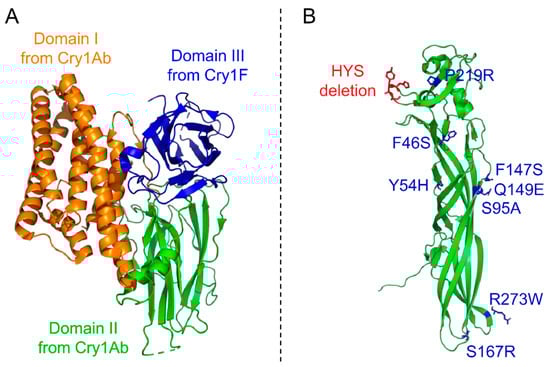 Structures of modified toxins with enhanced activity. (A) Structure of the tryptic core of the modified Cry1A.105 (PDB accession number: 6DJ4) toxin constituting domains I (orange) and II (green) from Cry1Ab and domain III (blue) from Cry1F [70]. (B) Structure of the Mpp51Aa2 toxin (formerly Cry51Aa2; PDB accession number: 5HD2) with eight mutated and three deleted residues to form the modified Cry51Aa2.834_16 toxin, highlighted in blue and green, respectively [78]. The 3D structures are represented in cartoon mode and the mutated residues in licorice mode using PyMOL Molecular Graphics System version 2.4.1.