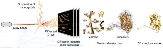 Protein crystals were discovered by chance more than 150 years ago and initially used for protein purification, but their main contribution to science is concomitant with the advent of X-ray crystallography in the late 1930s for the determination of three-dimensional structures of biological macromolecules [116,117]. The combination of the development of multiple crystallization methods [9,10,12], the implementation of cryogenic solutions limiting the propagation of X-ray-induced radiation damage [118], and the easy access to finely tuned and reliable X-ray synchrotron sources has allowed over 130,000 protein structures to be solved over the last 20 years [2]. It is therefore a method of choice for the determination of protein structures at high resolution. In synchrotron facilities, diffraction data are generally collected from a single oscillating macrocrystal (10–100 µm) to collect a complete dataset for reconstructing structures. Unfortunately, fragile macromolecules of complex architecture, such as membrane proteins or large protein complexes, and most proteins crystallized by living organisms generally form nano- to micrometer-sized crystals that are not amenable to structure determination by conventional oscillation methods at synchrotron sources. This is notably due to the progression of X-ray-induced radiation damage that is only delayed and not eliminated by flash-cooling (i.e., cryogenic conditions where the crystal is quickly frozen and maintained at a temperature of ~100 K). In practice, this means that the smaller the crystals, the more radiation sensitive they are and the more crystals are required to obtain a radiation-damage-free dataset [119,120]. The development of serial crystallography and the advent of X-ray free-electron lasers (XFEL) allowed this limitation to be bypassed. XFELs deliver the same amount of photons as synchrotrons but within tens of femtoseconds versus few milliseconds for the latter, allowing the collection of high-resolution diffraction patterns at room temperature (RT) before radiation damage onset via the so-called “diffraction before destruction” approach [121]. The most immediate consequence is that each crystal only contributes a unique diffraction pattern before it is destroyed by the X-ray beam, so thousands of homogenous microcrystals are required to be injected serially to collect a sufficient number of indexed patterns from different microcrystals in different orientations to determine the protein structure (Figure 4) [122,123].