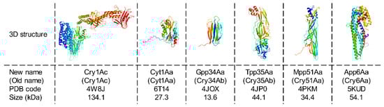 - Sun, Y.; Zhao, Q.; Xia, L.; Ding, X.; Hu, Q.; Federici, B.A.; Park, H.-W. Identification and Characterization of Three Previously Undescribed Crystal Proteins from Bacillus thuringiensis subsp. jegathesan. Appl. Environ. Microbiol. 2013, 79, 3364. [Google Scholar] [CrossRef]