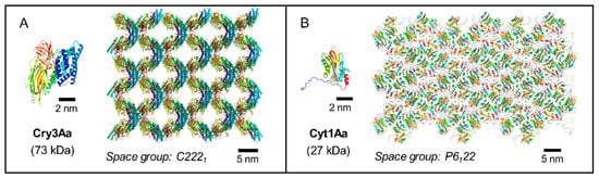 For example, Du et al. demonstrated that crystals of Cry1 toxins obtained in vivo by Bt and in vitro after denaturing treatment with urea both formed bipyramidal crystals, indicating that the shape and size of crystals were driven by the toxin itself []. However, the pH at which they dissolved strongly differed, i.e., 9.5–10.5 vs. 12 for in vivo and in vitro crystals, respectively, which supports that some key protein–protein interactions—notably involving disulfide bonds—that drive crystal dissolution can be stably established only within the bacterial cell []. This contrasts with Cry3Aa that can crystallize in vivo and in vitro while conserving similar features [,] and with Cyt1Aa for which the protoxin is unable to recrystallize in vitro [], notably due to contrasting crystal packing strategies between the protoxin and the toxin [].