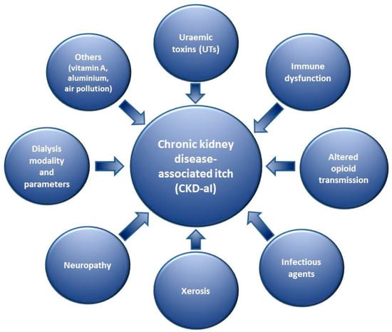 Itch (also referred to as pruritus) is defined as an unpleasant sensation leading to a desire to scratch. Based on its duration itch is classified as acute or chronic (CI), with the latter being present for more than 6 weeks in an affected individual [1]. CI may manifest in a continuous or intermittent manner, yet its long duration clearly implies an underlying disease-related context. Unsurprisingly, various conditions managed by different medical specialists are prone to be associated with CI. According to the classification proposed by the International Forum for the Study of Itch (IFSI), the aetiological causes of CI may be divided into cutaneous (I), systemic (II), neurologic (III), psychogenic (IV), mixed (V) and other (VI) [2]. Regardless of the common cutaneous diseases mostly managed by dermatologists which frequently present with CI (e.g., atopic dermatitis [AD], urticaria, psoriasis), there is a plethora of other associated chronic conditions of systemic nature, including hepatic, haematologic, oncologic, rheumatologic or renal. Regarding the latter group, a particular emphasis should be given to the spectrum of chronic kidney disease (CKD) which is defined as kidney damage or glomerular filtration rate (GFR) lower than 60 mL/min/1.73 m2 for a period of at least 3 months [3]. According to the GFR, five stages of CKD are mentioned, with the fifth stage (GFR < 15 mL/min/1.73 m2) also termed uraemia or end-stage renal disease (ESRD). The impact of CKD is vast in all regions of the world. According to Hill et al. [4], the global prevalence of CKD (all stages) was estimated as 13.4%, stages 3–5 affected 10.6% of population, whereas stage 5–0.1%. In 2017 there were 697.5 million new cases of CKD recorded, with 1.2 million of deaths associated with CKD [5]. It is obvious that with such overwhelming epidemiological figures, the everyday clinical practice shall reveal marked heterogeneity in patients’ characteristics, possibly with varying causes of the disease, clinical course, expected consequences and preferable clinical management. This remains valid especially in the context of age groups. Population aging and common crucial risk factors for CKD development, such presence of diabetes and hypertension, have all contributed to the growing magnitude of CKD over the last decades, especially in the elderly [5]. Unfortunately, the global CKD burden also stems from its presence in paediatric population. The prevalence of CKD varies between 15–74.7 per million children in different geographic regions [6]. In 2008, the median reported incidence of renal replacement therapy reached 9 per million children worldwide, with values ranging between 4 to 18 per million in different countries [7]. The aforementioned heterogeneity between different age groups is also expressed via the aetiological factors contributing to the development of CKD. While adults mostly develop CKD due to diabetic nephropathy, hypertension and autosomal dominant polycystic kidney disease (ADPKD), the leading causes in children encompass congenital anomalies of the kidney and urinary tract (CAKUT), hereditary nephropathies and glomerulonephritis [8]. The major CKD complications in children are cardiovascular disease (CVD) presenting with hypertension and/or dyslipidaemia, impaired cognitive development, anaemia, poor or slowed growth, decreased appetite or even death [9]. ESRD is associated with 30 times higher likelihood of mortality than in healthy children [10]. Moreover, young patients with CKD have significantly reduced health-related quality of life (HRQoL) in its various domains [11,12,13]; this also concerns their caregivers [13].