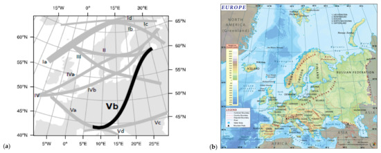 Map of cyclone tracks over Europe. (a) The divergence of track a “Vb” cyclone over the Ligurian Sea and northern Adriatic Sea [48]. (b) Map of Europe with countries and relief [51].