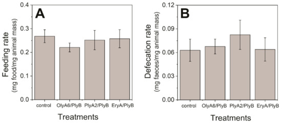 There were no statistically significant differences between the feeding rates and defecation rates of the control woodlice and those exposed to these treatments (Figure 1; p ˃ 0.05; Mann–Whitney tests). There was also no mortality of these woodlice for any of these treatments (i.e., OlyA6/PlyB, PlyA2/PlyB, EryA/PlyB). We can thus conclude that none of the treatments affected the feeding physiology and survival of these woodlice.