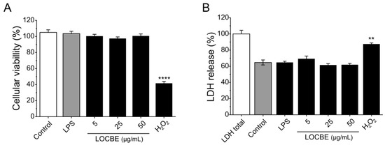 Effect of LOCBE on macrophage viability. (A) Cellular viability was measured by MTT assay after 24 h of treatment with three different concentrations of LOCBE. Hydrogen peroxide (H2O2) was used as the positive control. (B) Supernatants from the MTT assay were used to evaluate LDH release as a cytotoxicity marker. All data represent the mean ± S.E.M. Significant differences between the control and treatments were evaluated using Student’s t-test. (n = 3, ** p < 0.01; **** p < 0.0001 vs. control 100%).