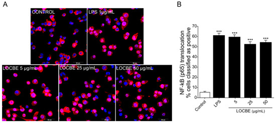 Effect of LOCBE on NF-κB pathway activation. (A) Representative images of NF-κB nuclear translocation verified by high content imaging after 30 min of THP1-derived macrophages treatment with LOCBE. Macrophages were fixed and immunostained for NF-κB (p65) antibody and secondary AlexaFluor-647 and the nuclei (blue) were stained with Hoechst 33342 (5 µM). (B) NF-κB translocation was calculated by measuring the ratio of fluorescent intensity of the protein in the nucleus and cytoplasm region. Data are expressed as the percentage of positive cells. Negative cells mainly displayed cytoplasmatic staining of NF-κB (red). Stimulation with LPS or LOCBE caused translocation of NF-κB to the nucleus. Data represent the mean ± S.E.M. Significant differences between the control and treatments were performed by Student’s t-test (n = 3, *** p < 0.001).