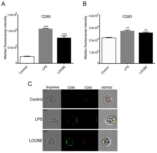 LOCBE increases the expression of macrophage activation markers. Macrophages were treated 24 h with LOCBE at 5 μg/mL, then stained with specific antibodies for CD80-BB515 (A) and CD83-APC (B) followed by Imaging flow Cytometry analysis. Data are shown as the mean of Median of Fluorescence Intensity (MFI) ± S.E.M. (C) Representative images of CD80 (green) and CD83 (red) staining. (** p < 0.01, *** p < 0.001).