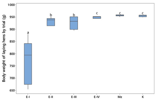 Body weight of laying hens by trial (g) a, b, c—values followed by the same letter superscript are not different at p < 0.05 (according to Tukey’s method).