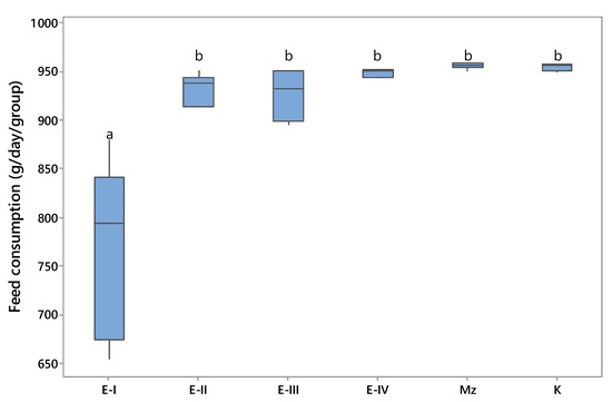 Feed consumption (g/day/per group) a, b—values followed by the same letter superscript are not different at p < 0.05 (according to Tukey’s method).