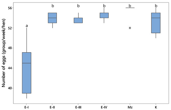 Number of eggs, group/week/hen a,b—values followed by the same letter superscript are not different at p < 0.05 (according to Tukey’s method). Asterisk (*) identified the outliers which are observed at least 1.5 times of the interquartile range (Q3–Q1) from the edge of the boxplots.