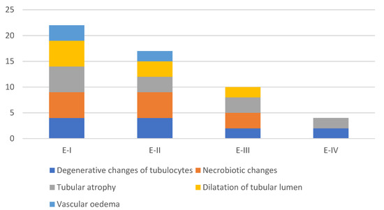 (a) Tubular atrophy, E-II group (black arrows); (b) degenerative changes of tubulocytes (cloudy and hydropic degeneration) E-II group (white arrows); (c) tubular atrophy, E-IV group (yellow arrows); (d) degenerative changes of tubulocytes, E-IV group blue arrows).
