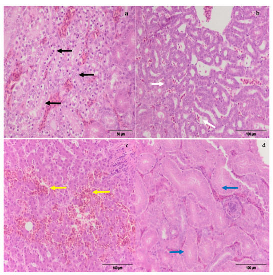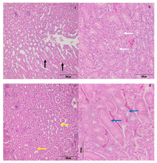 (a) Necrobiotic changes (karyopyknosis, karyorrhexis, karyolysis) (black arrows), E-I group; (b) tubular atrophy, E-I group (white arrows); (c) hemorrhagic areas with massive effusion of red blood cells (yellow arrows), E-I group; (d) degenerative changes of tubulocytes (cloudy and hydropic degeneration) E-III group (blue arrows).