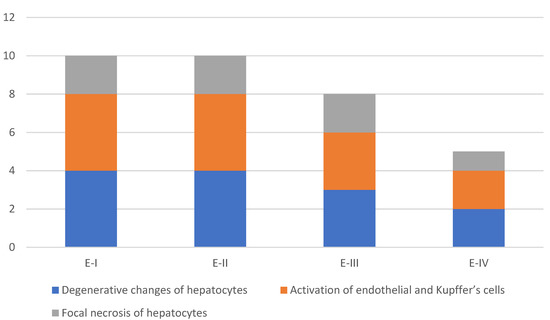 The incidence and severity of histopathological changes in the liver are presented in Figure 7 and Figure 8. A similar pattern was observed in the liver. Histopathological examination of the liver showed degenerative changes (cloudy swelling, vacuolar degeneration, fatty change), focal necrosis of hepatocytes, and the activation of endothelial and Kupffer’s cells, mainly present in the hens treated with different amounts of OTA. Similarly to in the kidney, the changes were less pronounced in the hens which, in addition to OTA in feed, received the adsorbent, MZ.